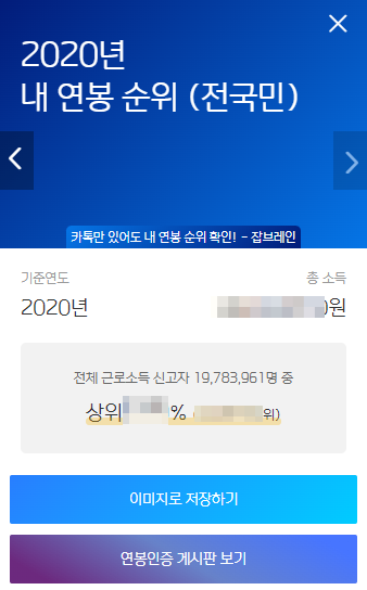 그리고 '내 연봉 순위(전국민) 보기' 를 클릭하시면 소득이 신고된 전체 근로소득자 중 나의 연봉 순위와 상위 몇 퍼센트인지 조회가 가능합니다.
