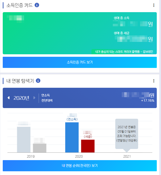 그러면 아래와 같이 소득인증 카드, 내 연봉 탐색기를 조회하실 수 있습니다.