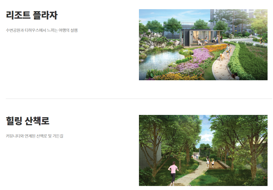 롯데캐슬 아파트들은 조경에 굉장히 신경을 쓰는 편인데요. 가든이나 산책로, 플라자 등이 잘 조성될 것 같습니다.